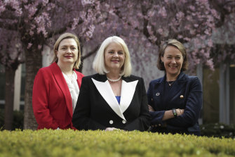 Science Minister Karen Andrews (centre), with Defence chief scientist Tanya Monro (left) and DFAT chief innovation officer Sarah Pearson (right), says Australia is experiencing an "unprecedented" level of female leadership in science. CREDIT:ALEX ELLINGHAUSEN